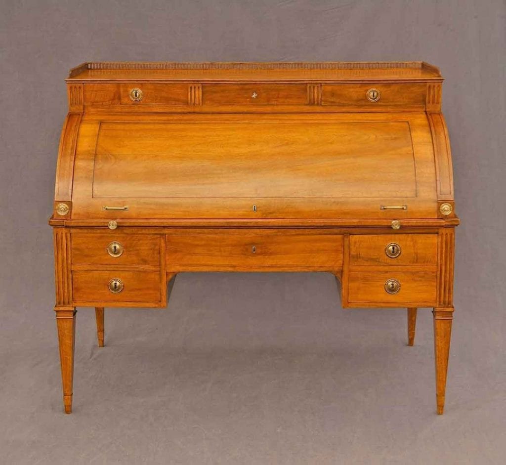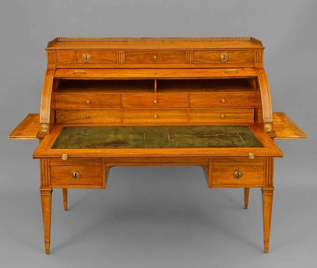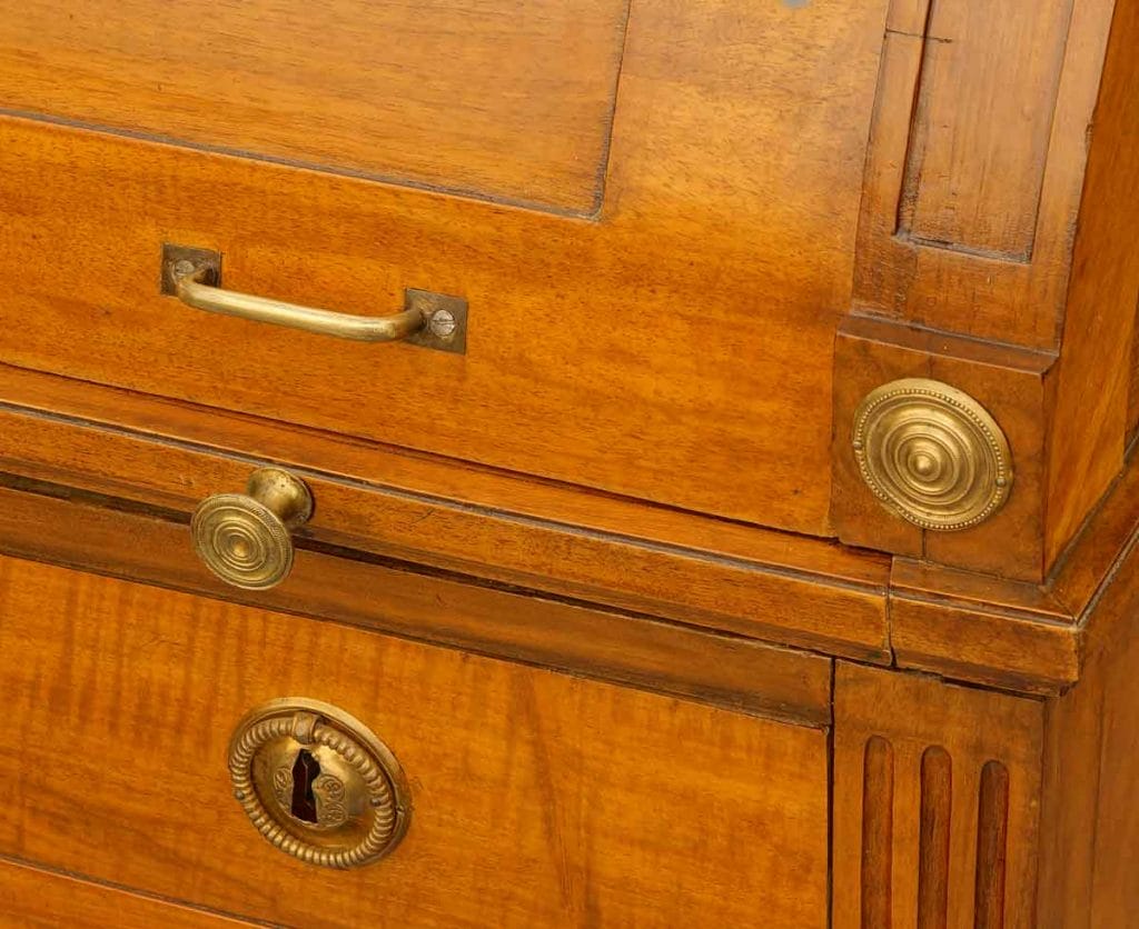 Formsprache: Die Möbelstücke wirken oft architektonisch. Säulen, Pilaster und Kannelierungen (vertikale Rillen) sind häufige Motive. Ein Zylinderbüro aus dieser Zeit war nie bloßer Gebrauchsgegenstand, sondern ein kleines Monument im Raum und natürlich auch ein Statussymbol.