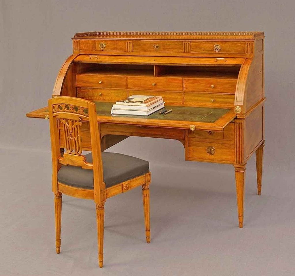 Louis-XVI-Stuhl vor einem Empire-Zylinderbüro