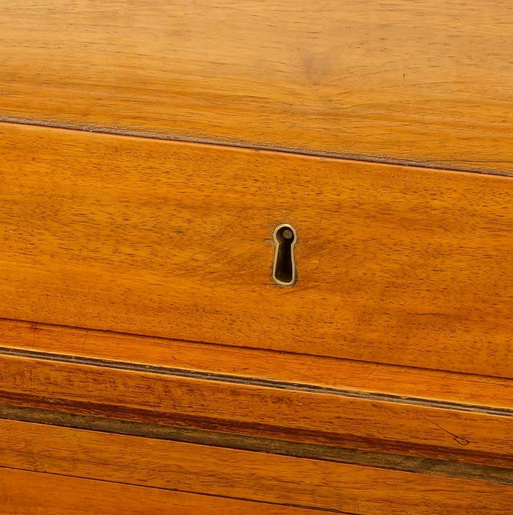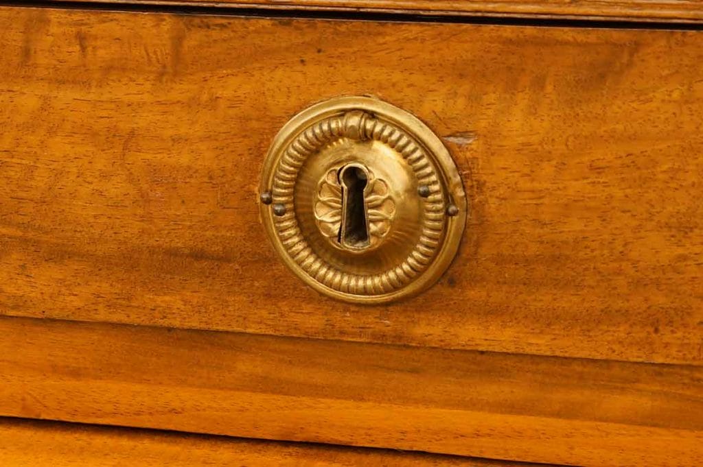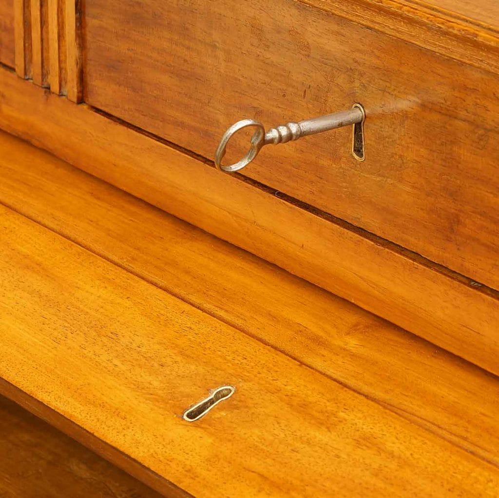 Bild mit zwei eingelassenen Schlüsselbuchsen und einem Schlüssel an einem Empire-Zylinderbüro.