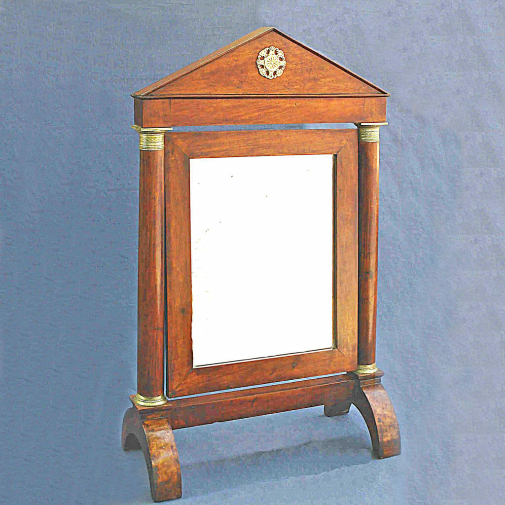Kleine Empire-Psyche, (Standspiegel), Frankreich um 1810, Nussbaum massiv und furniert sowie Nadelholz als Rückwand, originales altes Spiegelglas sowie Basen und Kapitelle.