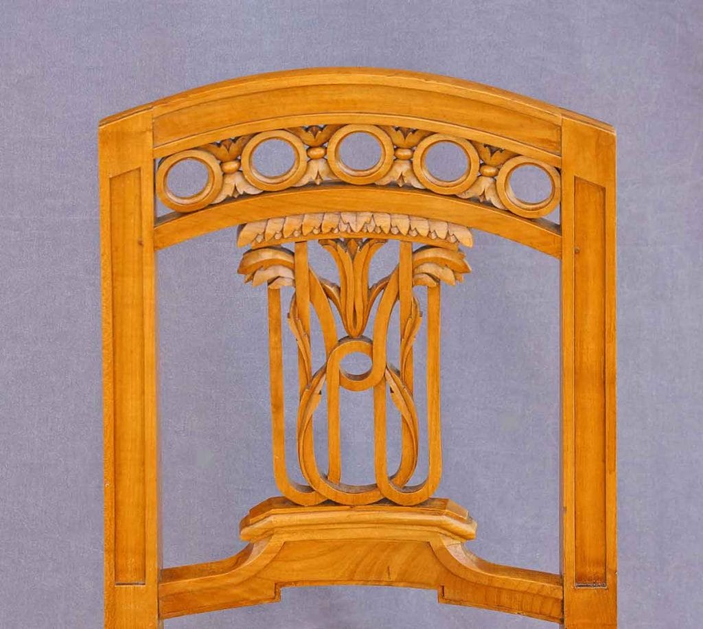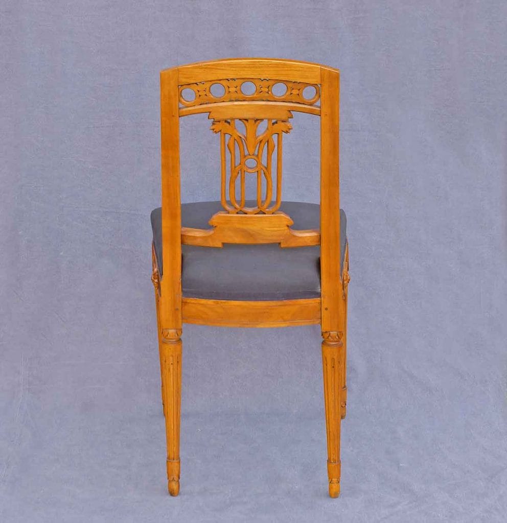 Vasen- und Lyramotiv: Die zentrale Rückenlehne zeigt eine stilisierte Vase oder Lyra – beides Symbole für Kultur und Harmonie, die im Klassizismus allgegenwärtig waren.