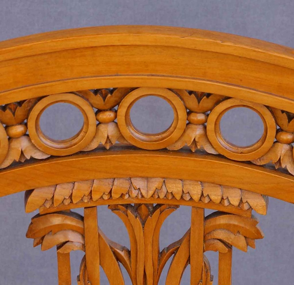 Die Reihe aus durchbrochenen Ringen am oberen Abschluss der Lehne ist ein sehr spezifisches Merkmal, das man häufig bei hochwertigen Möbeln aus deutschen Werkstätten dieser Epoche findet. Es verleiht dem Möbelstück Leichtigkeit und Eleganz.