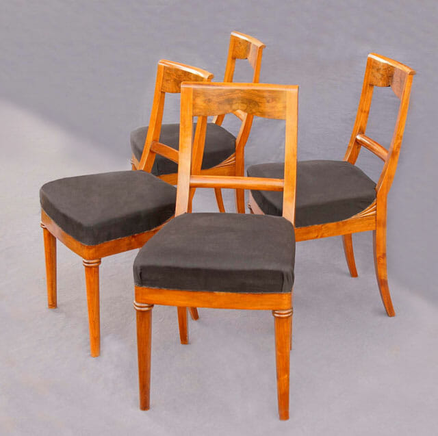 Satz von vier Biedermeier-Stühlen, südwestdeutsch um 1835, Nussbaum massiv und furniert mit gedrechselten Beinen und geschnitzten Zwickeln zwischen Zarge und Lehnenpfosten.